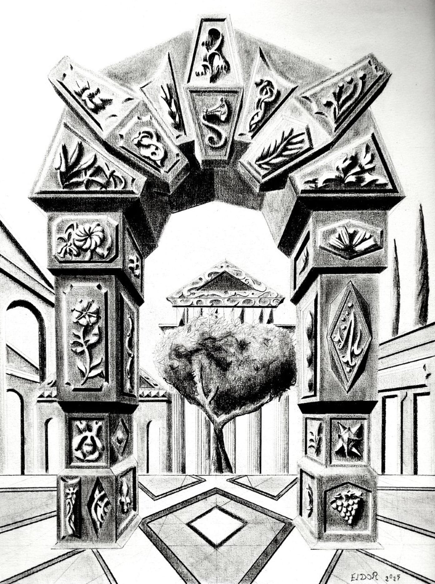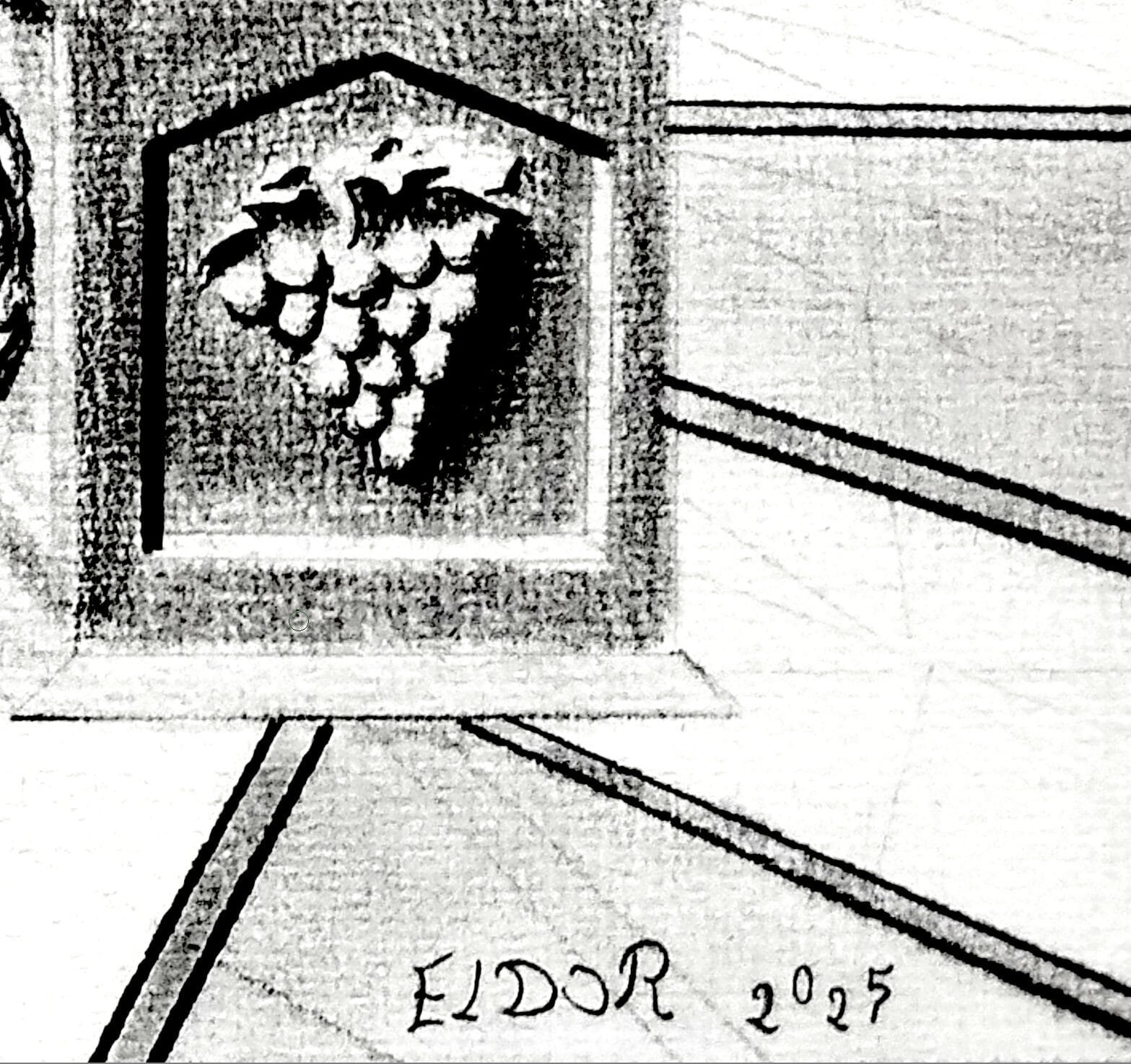This architectural illustration by Eldor Art embodies the elegance of classical design through meticulous linework and symbolic detail. Rendered entirely by hand in black and white, the drawing showcases a majestic archway constructed from intricately carved blocks—each one adorned with floral motifs, abstract patterns, and mythical figures that echo centuries of ornamental tradition.