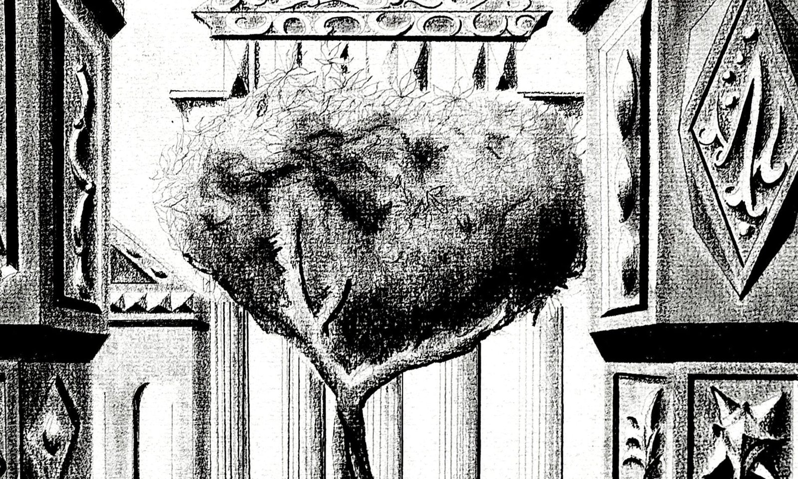 Beyond the arch, a stately classical building with fluted columns rises in quiet grandeur, while a tree with a dense, leafy canopy adds organic contrast and depth. The foreground features a geometric diamond pattern, reinforcing the composition’s symmetry and visual rhythm.