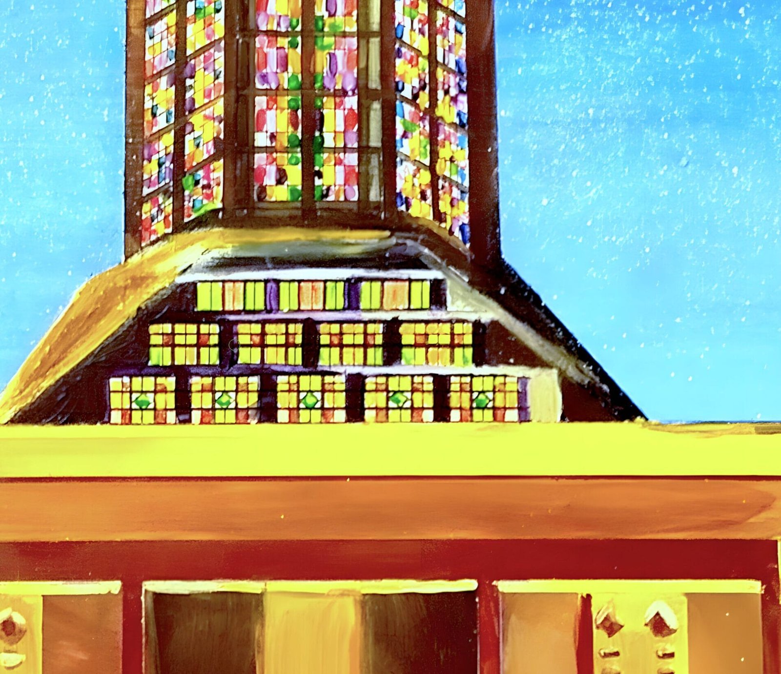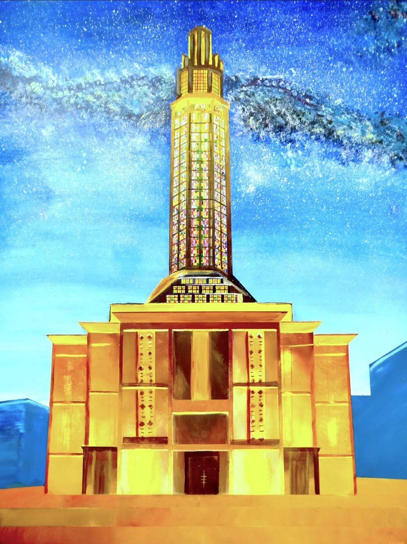 A golden bell tower rises beneath a star-filled sky, its warm illumination glowing against the cool blues of night. The composition evokes a sense of timeless grandeur and contemplative solitude—an architectural dreamscape rendered with surreal elegance.