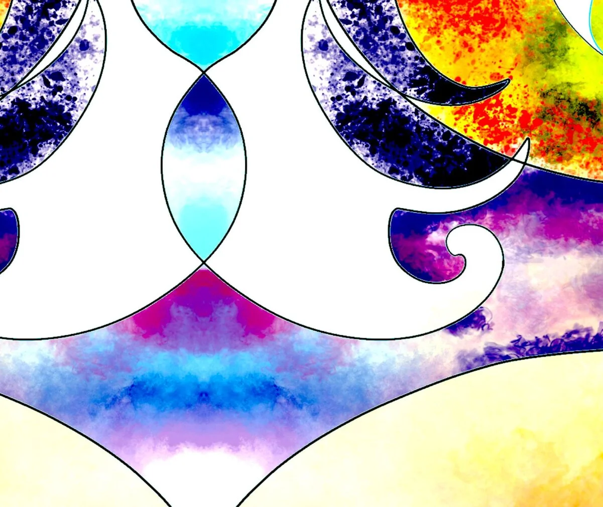 This Solar Radiance art print is a vibrant and symmetrical digital painting by Eldor Art, an independent artist known for blending color, balance, and emotion. The composition features mirrored organic shapes that evoke radiant energy, stylized wings, or calligraphic forms. The central glow transitions from bright yellow to soft gradients of white, blue, and purple, creating a luminous effect that draws the eye inward.