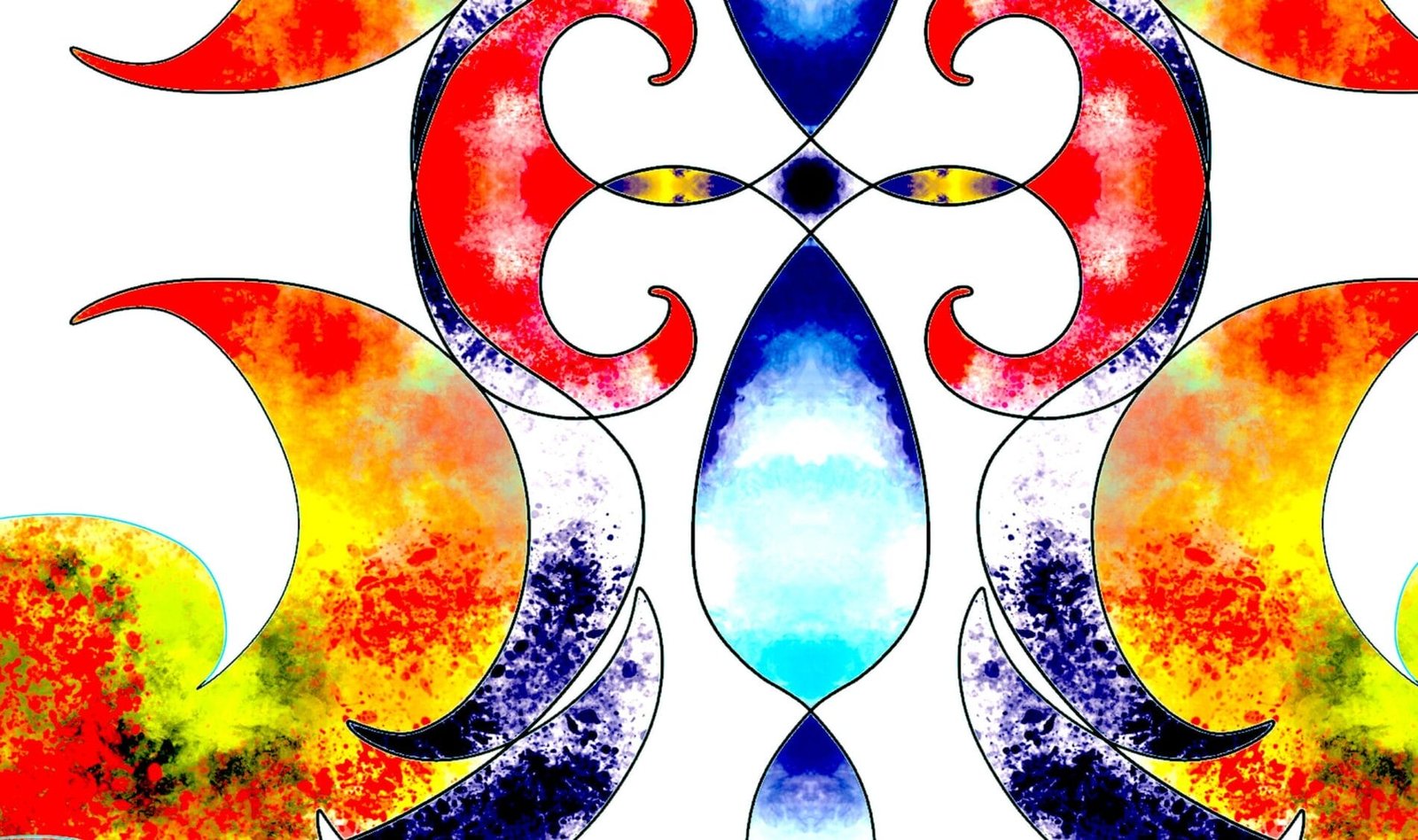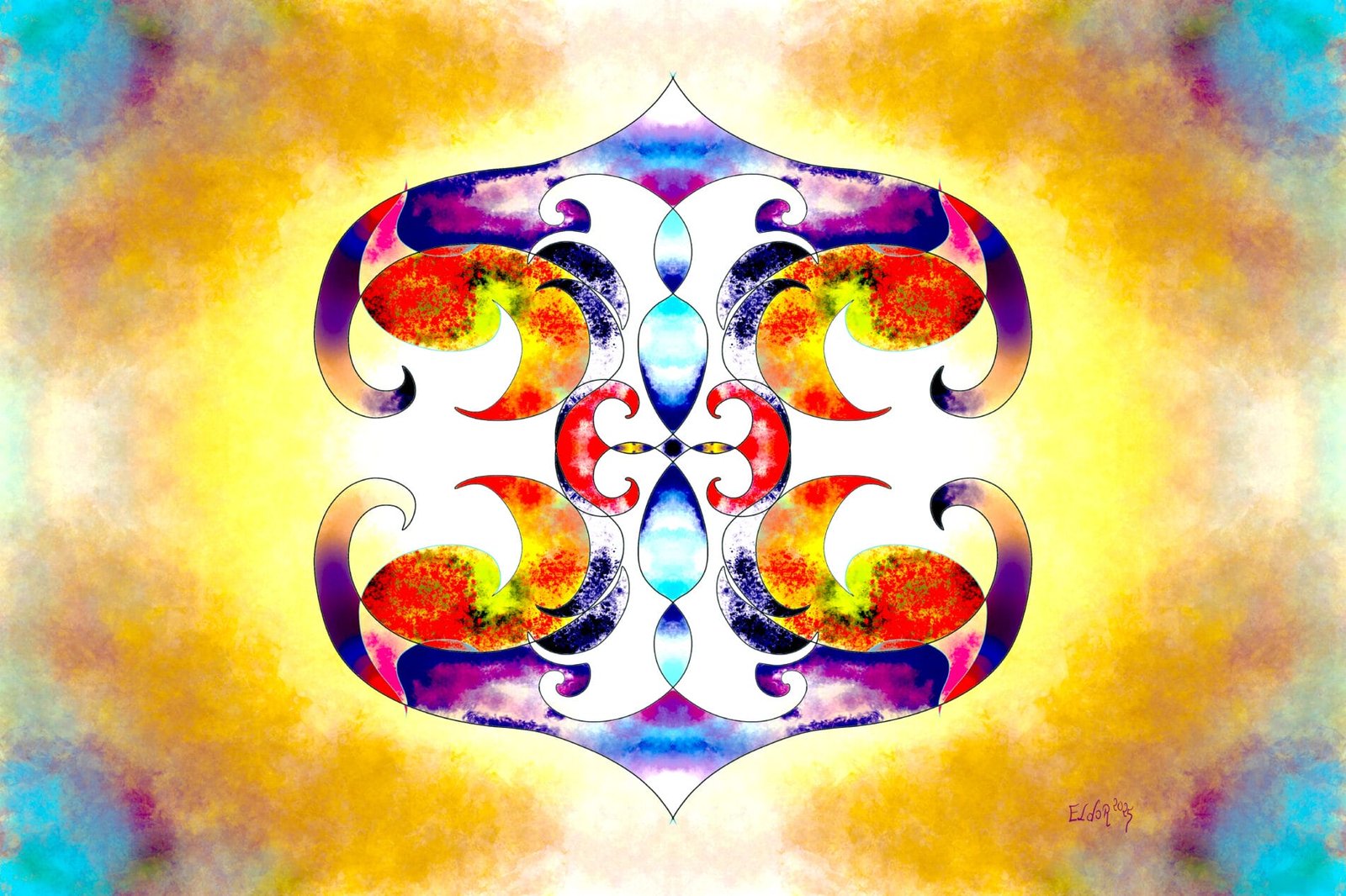 At the heart of the piece lies a mandala-like motif—swirling crescents and flame-like curves arranged in perfect symmetry. The design is mirrored along both axes, creating a rhythmic balance that draws the viewer inward. A rich palette of reds, yellows, blues, and purples pulses against a watercolor-inspired background, transitioning from golden light to deep cosmic hues.