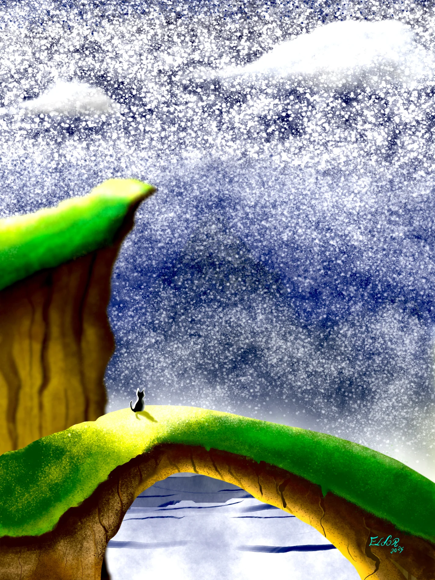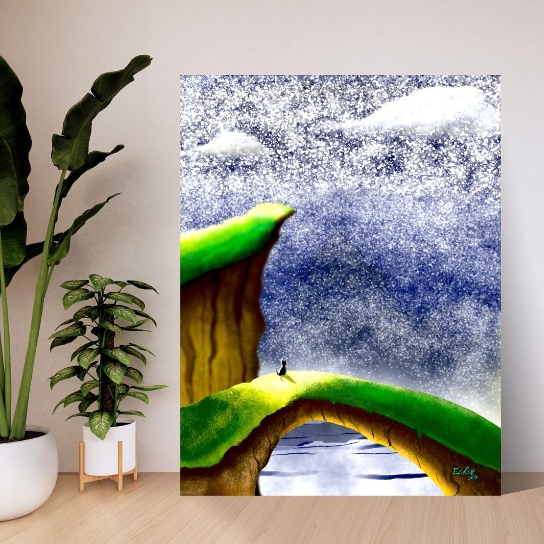 About the Artwork Escape Cat is a surreal digital painting by Eldor, created as a tribute to the spirit of exploration embodied by the cat—an animal driven by instinct to escape, roam, and discover the world beyond. The composition features a lone feline figure standing on a curved grassy bridge suspended between two cliffs, under a sky filled with stars or snow. The scene evokes freedom, solitude, and the quiet bravery of those who seek the unknown.