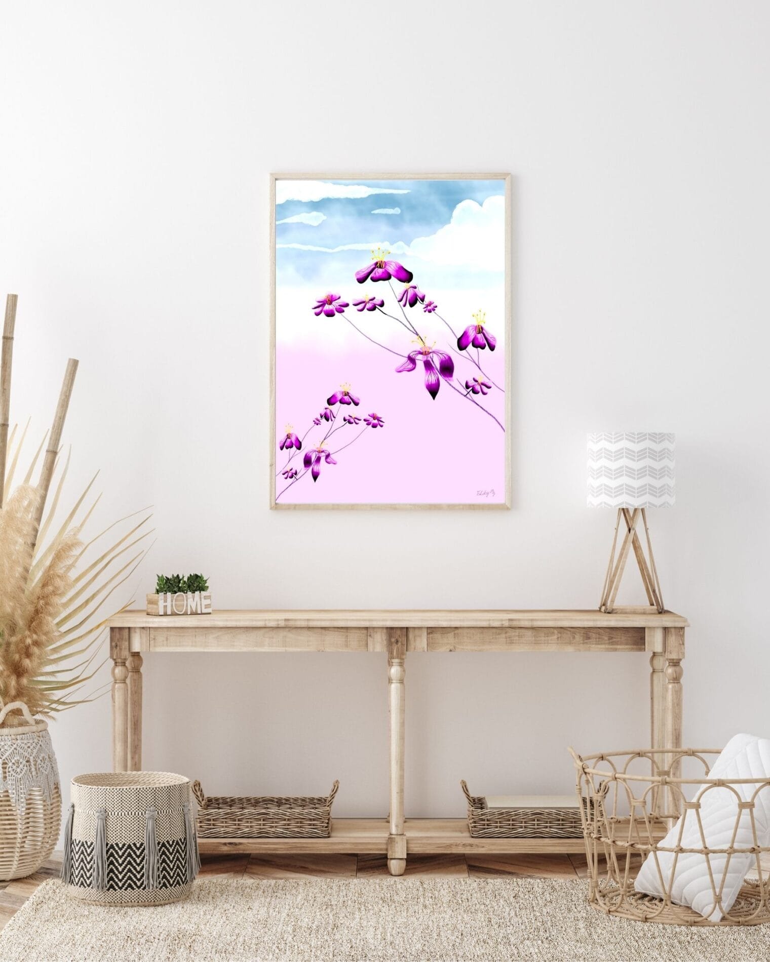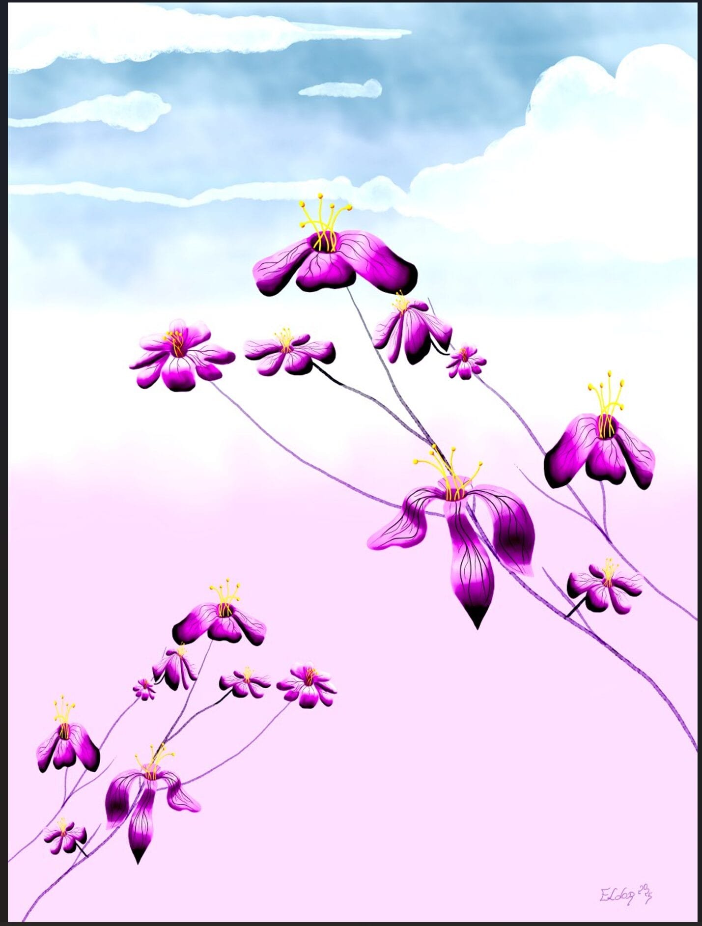 Purple Bloom is a digital artwork by Eldor Art that captures the quiet poetry of nature. Delicate purple flowers rise on curved stems beneath a pastel sky, evoking serenity and surreal beauty. This piece blends dreamlike composition with precise detail, inviting the viewer into a moment suspended between reality and imagination.